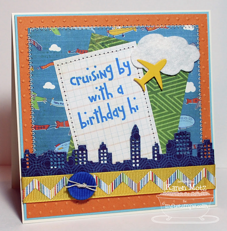 I used You Move Me stamps and Die-namics for the main sentiment panel and cut the airplane out of Lemon Drop card stock. The middle size of the Cloud Trio Die-namics was perfect to cut out the Puff Cloud White felt. Of course, every airplane looks good flying over a skyline, so I used the Skyline Border Die-namics to cut out the blue patterned paper and added some Lemon Drop grosgrain ribbon below it. I used the Chevron Stripes Die-namics to cut out the striped paper and added a blue corduroy button for another masculine touch. The base card stock layers are Orange Fizz and Berrylicious, and the patterned paper is Echo Park A Boy's Life.